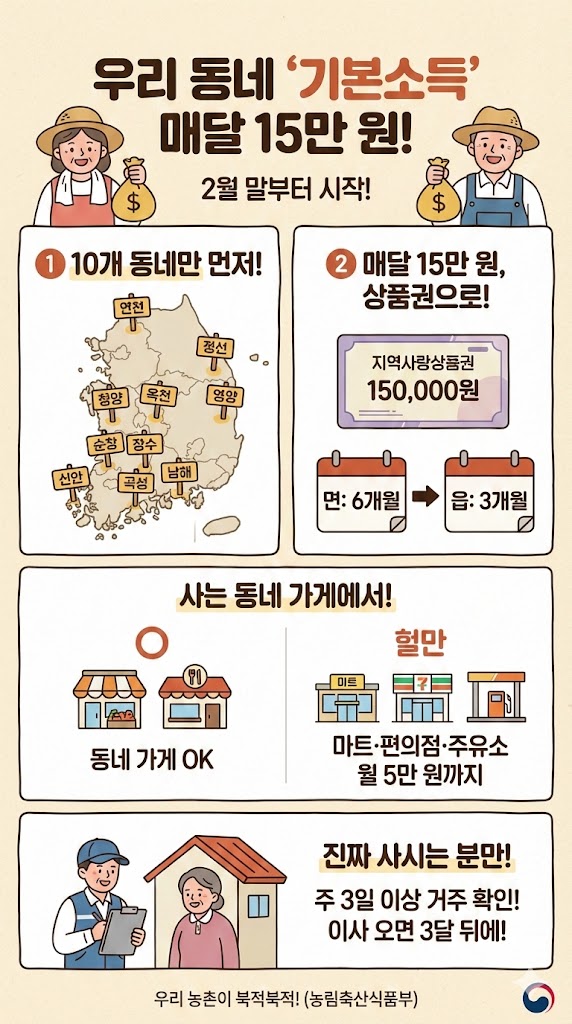 농사를 지으시거나 어촌에 사시는 주민 여러분, 반가운 소식입니다! 정부에서 인구가 줄어드는 마을을 살리기 위해 2026년 2월 말부터 매달 15만 원을 지원하기로 했습니다. 누가 받는지, 어떻게 쓰는지 알기 쉽게 설명해 드릴게요.