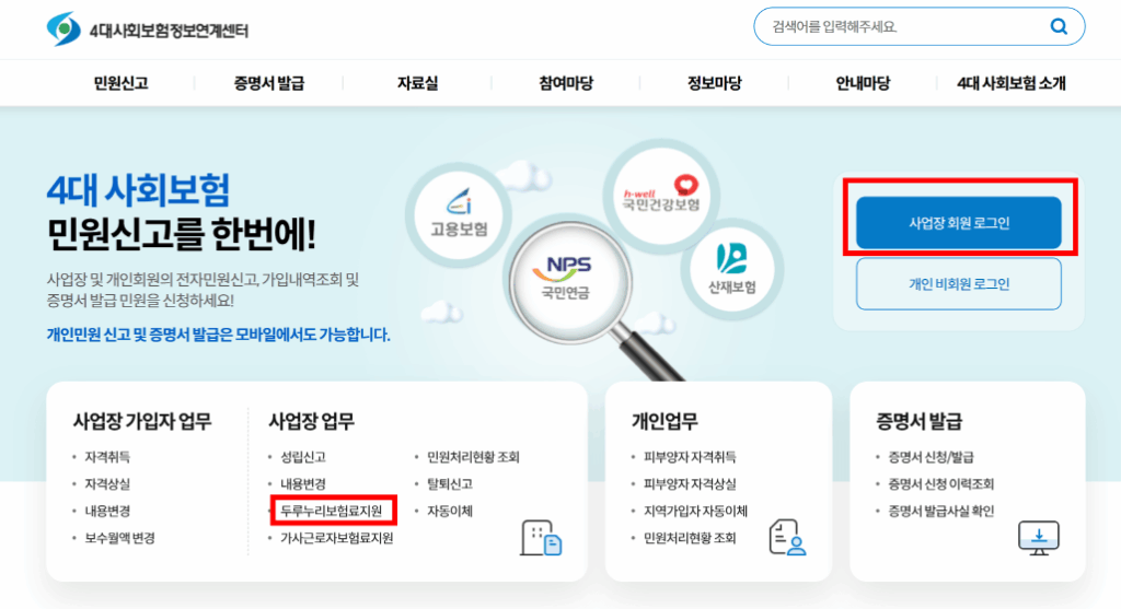 - 로그인 후 메뉴 선택: [사업장 업무] → [두루누리 보험료 지원] 클릭