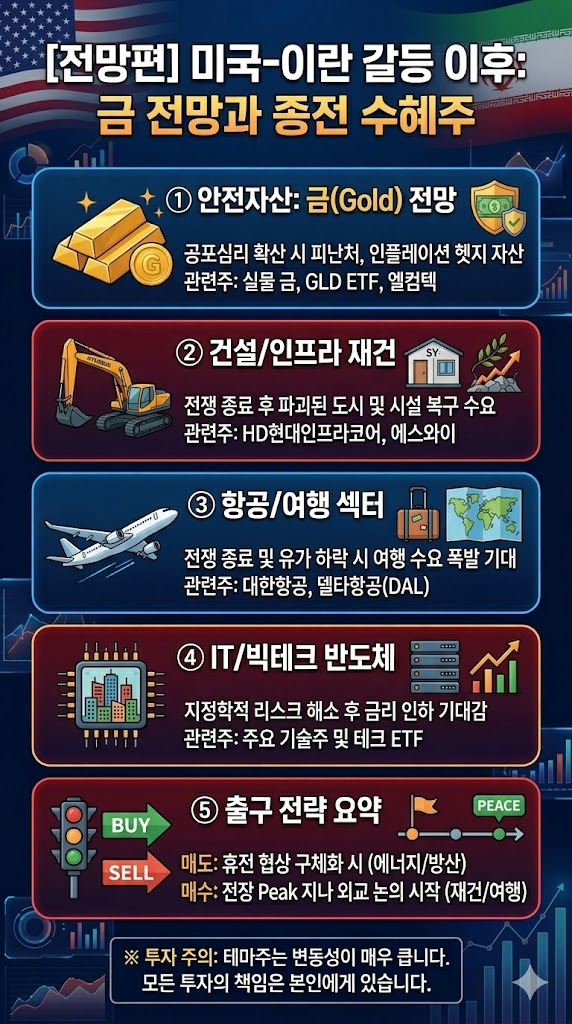 • 매수 타이밍: 재건주나 항공주는 전쟁의 피크(Peak)를 지나 외교적 해결책이 거론될 때부터 분할 매수를 시작하는 것이 좋습니다.