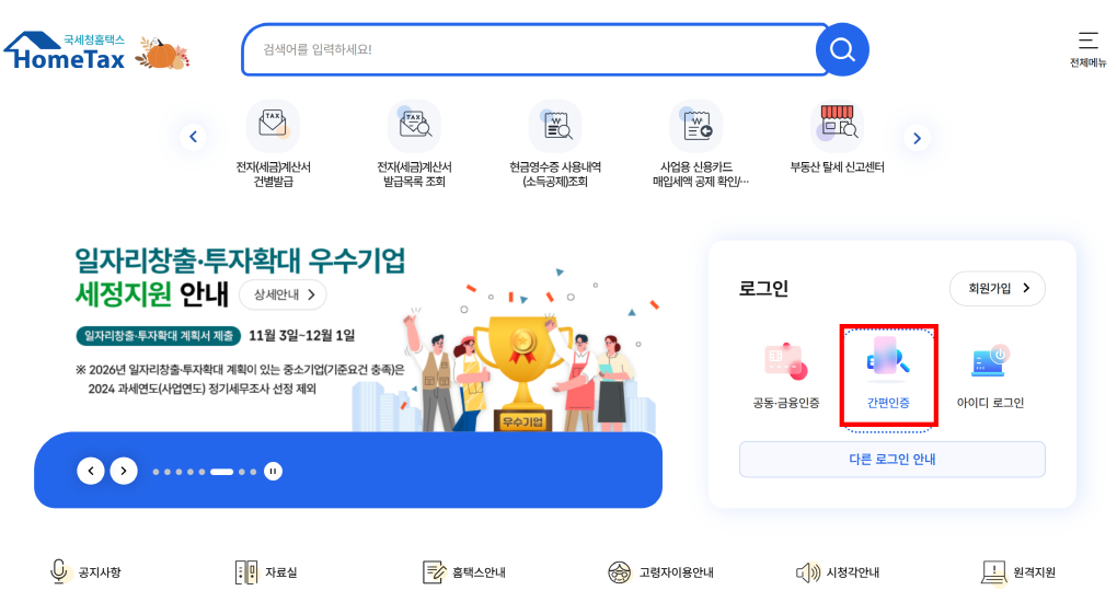 로그인 경로: 홈택스 메인 → 로그인 → 간편인증