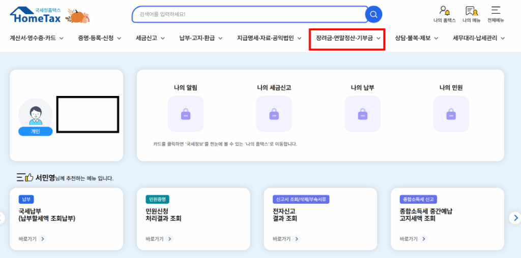 - 상단 메뉴에서 ‘장려금·연말정산·기부금’ 선택
