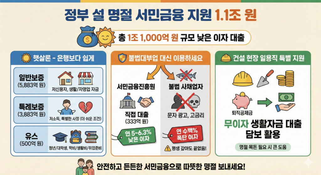 설 명절을 전후한 2개월 동안 정부가 서민들을 위해 총 1조 1,000억 원 규모의 저금리 대출을 지원합니다. 명절 기간 늘어나는 자금 수요를 충당하고, 은행권 이용이 어려운 분들이 불법 사채의 늪에 빠지지 않도록 돕기 위한 조치입니다. 신용등급이 낮거나 소득이 적어도 신청이 가능하니 아래 내용을 확인해 보시기 바랍니다.