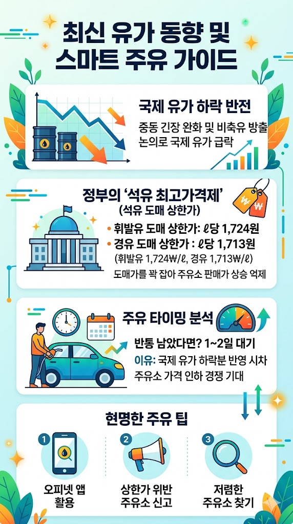 국제 유가가 떨어지면 보통 1~2주의 시차를 두고 국내 주유소 가격에도 반영이 됩니다. 여기서 중요한 포인트가 있습니다. 지금은 정부가 도매가를 1,724원으로 꽉 눌러놓은 상태에서 국제 시장 상황까지 하락세로 돌아섰다는 것입니다. 즉, 지금보다 가격이 더 오를 확률보다는 며칠 뒤 주유소 판매가가 1,800원대 중반이나 그 아래로 서서히 내려갈 확률이 훨씬 높습니다.