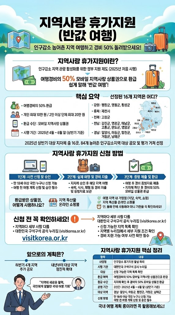 올해 4월부터 농어촌 인구감소지역을 여행하면 경비의 절반을 돌려받을 수 있는 ‘지역사랑 휴가지원(반값 여행)’ 사업이 처음 시작됩니다. 문화체육관광부와 기획예산처가 한국관광공사와 함께 추진하는 이 사업, 지금 바로 핵심 내용을 확인해보세요.
