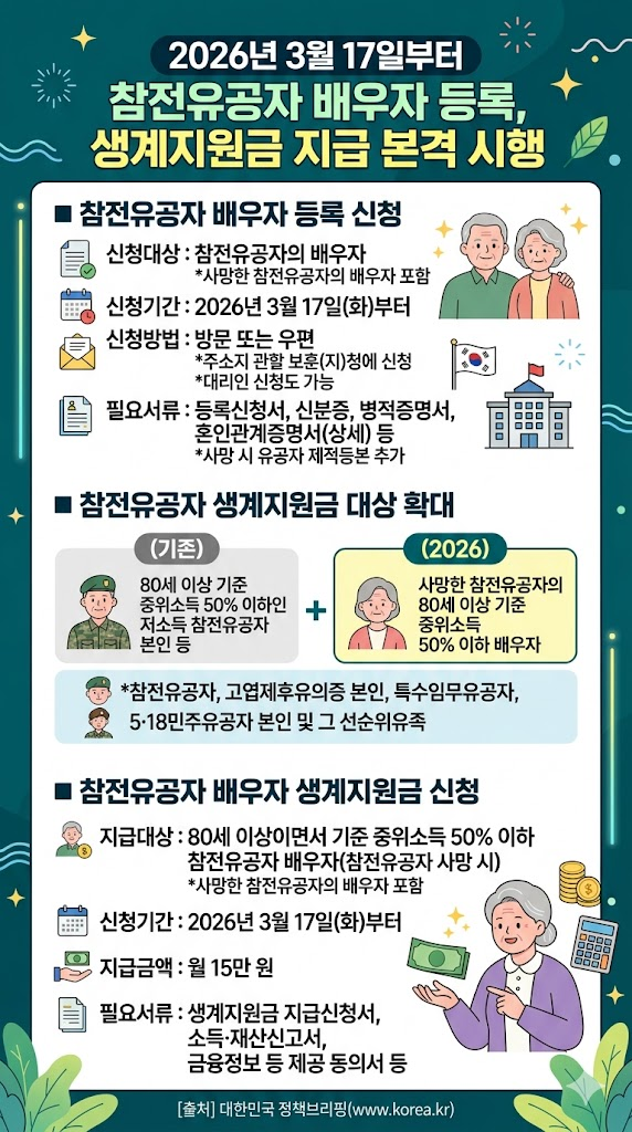2026년 3월 17일부터 ‘참전유공자 배우자’ 지원이 대폭 확대됩니다! 그동안 국가를 위해 헌신하신 참전유공자 본인 위주였던 지원 제도가, 올해 3월 17일부터는 홀로 남으신 배우자분들까지 혜택을 받으실 수 있도록 개선되었습니다. 신청 방법과 대상을 꼼꼼히 확인해 보세요.