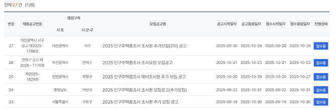 오늘 기준 공고문은 27건 있습니다. 지역을 확인하고 접수를 하시면 됩니다.