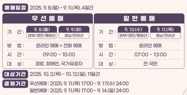 교통약자 사전예매 | 9월 15일(월) ~ 9월 16일(화) 9시~15시 | 경로·장애인·국가유공자 대상 |