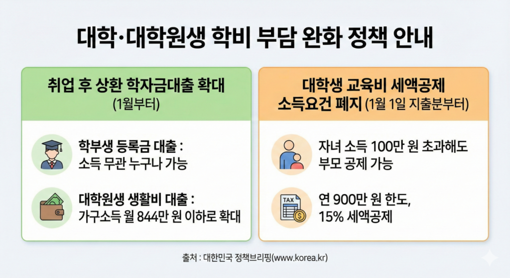 2026년부터는 집안 형편 걱정 없이 누구나 학자금 대출받을 수 있고, 알바해도 부모님이 세금 혜택 받을 수 있어요. 경제적 부담 때문에 공부를 포기할 필요가 없다는 거죠!