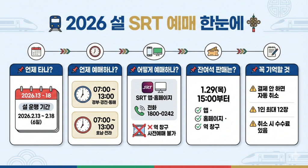 2026년 새해를 맞아 민족 대명절 설날을 준비할 시기가 다가왔습니다. 명절마다 돌아오는 ‘기차표 전쟁’ 때문에 벌써 걱정하고 계시는 분들 많으실 텐데요. KTX 못 타시는 분들은 SRT로 예약 많이들 하시죠. 설 명절에는 SRT 승차권이 매우 빨리 매진되니까요. 아래 일정과 꿀팁을 확인하시고 꼭 예매 성공하시길 바랍니다.