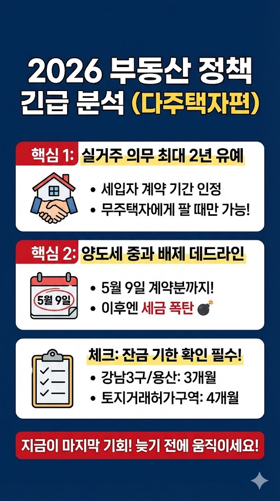 이번 정책은 다주택자들에게 “마지막으로 탈출할 길을 열어줄 테니 서두르세요”라고 말하는 것과 같습니다. 5월 9일까지 계약을 마쳐야만 세금 폭탄(양도세 중과)을 피할 수 있기 때문입니다.