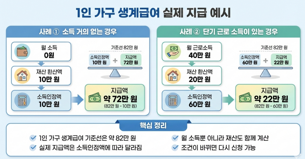 많은 분들이 “1인 가구는 82만 원을 받는다”고 생각하지만, 실제 지급액은 다릅니다.