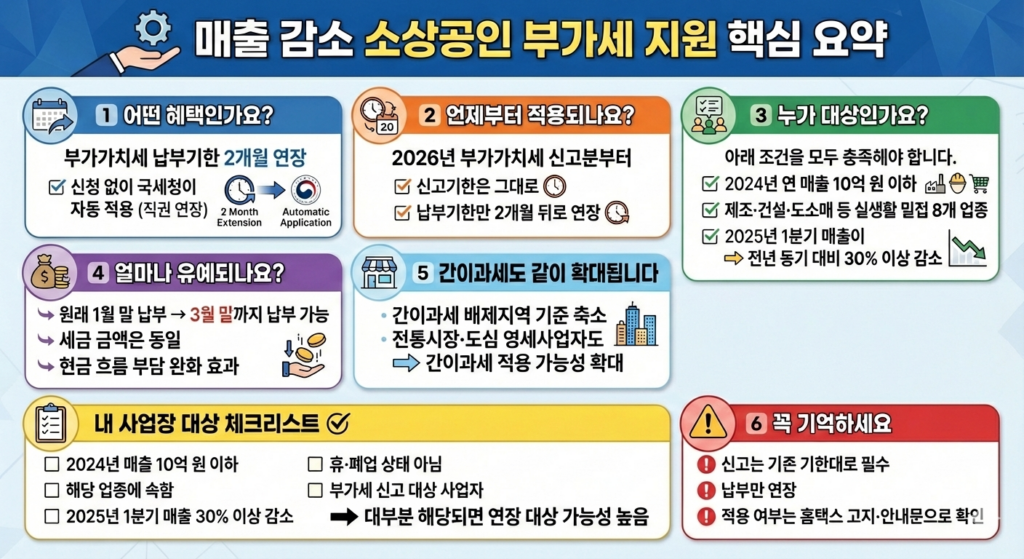 - 매출이 크게 줄어든 소상공인은 2026년 부가세 납부기한 2개월 연장