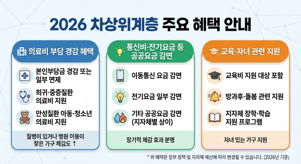 차상위계층 혜택은 한 번에 돈을 받는 방식이 아닙니다. 대신 의료비, 공공요금, 교육비 등 지출이 반복되는 영역에서 부담을 줄여주는 구조입니다.