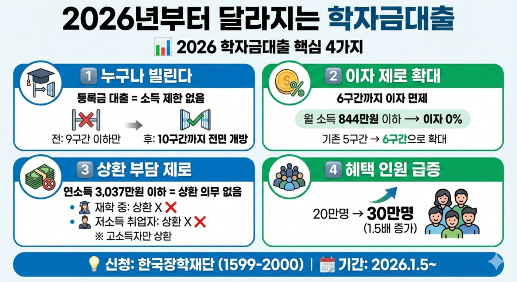 대학생들에게 정말 중요한 소식을 가져왔습니다. 2026년부터 학자금대출 제도가 크게 바뀌는데요, 한마디로 “더 많은 사람들이, 더 쉽게 빌릴 수 있게” 된다고 보시면 됩니다. 학자금대출은 대학교 다닐 때 돈이 부족한 학생들에게 나라에서 빌려주는 돈이죠. 근데, 일반 은행에서 빌리는 것보다 뭐가 좋은지 알고는 계신가요?