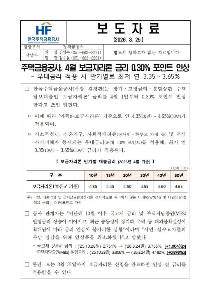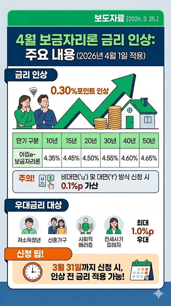 한국주택금융공사(HF)가 오는 2026년 4월 1일부터 보금자리론 금리를 0.30%포인트 인상한다고 발표했습니다. 최근 국고채 금리 상승과 대외 불확실성 여파로 인한 결정인데요. 대출을 계획 중이신 분들을 위해 핵심 내용을 정리해 드립니다.