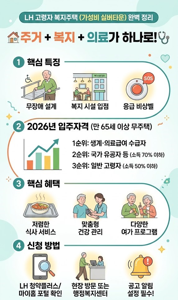 나이가 들수록 주거와 건강은 떼려야 뗄 수 없는 고민입니다. 최근 ‘가성비 실버타운’으로 주목받는 LH 고령자 복지주택의 핵심 정보를 요약해 드립니다. 일반 임대주택과 달리 주거와 복지 서비스가 결합되어 있어 자녀분들의 문의도 끊이지 않고 있습니다. 오늘은 2026년 기준 신청 자격부터 실제 혜택까지 핵심 내용만 정리해 드립니다.